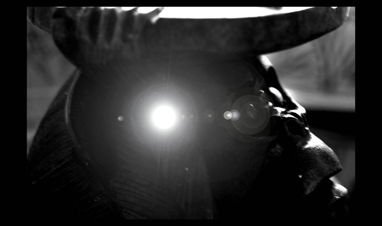 j'ai voulu représenté un singe tenant un cendrier, avec le spot qui fait songer a l'alignement des planètes se prolongeant dans l'œil du singe qui serai l'homme ....
