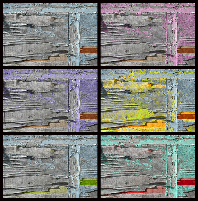 Tu as essayé d'inverser la photo en symétrie verticale et de refaire le traitement avec d'autres couleurs pour la bande de peinture? ça te ferait un panneau avec une déclinaison sur six vignettes