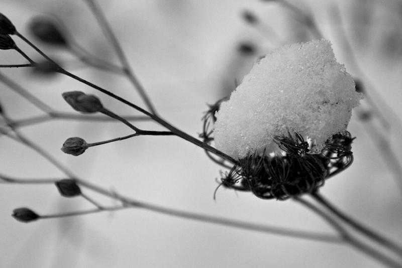 Un peu mômifiée, une ombelle de carotte sauvage sous la neige.