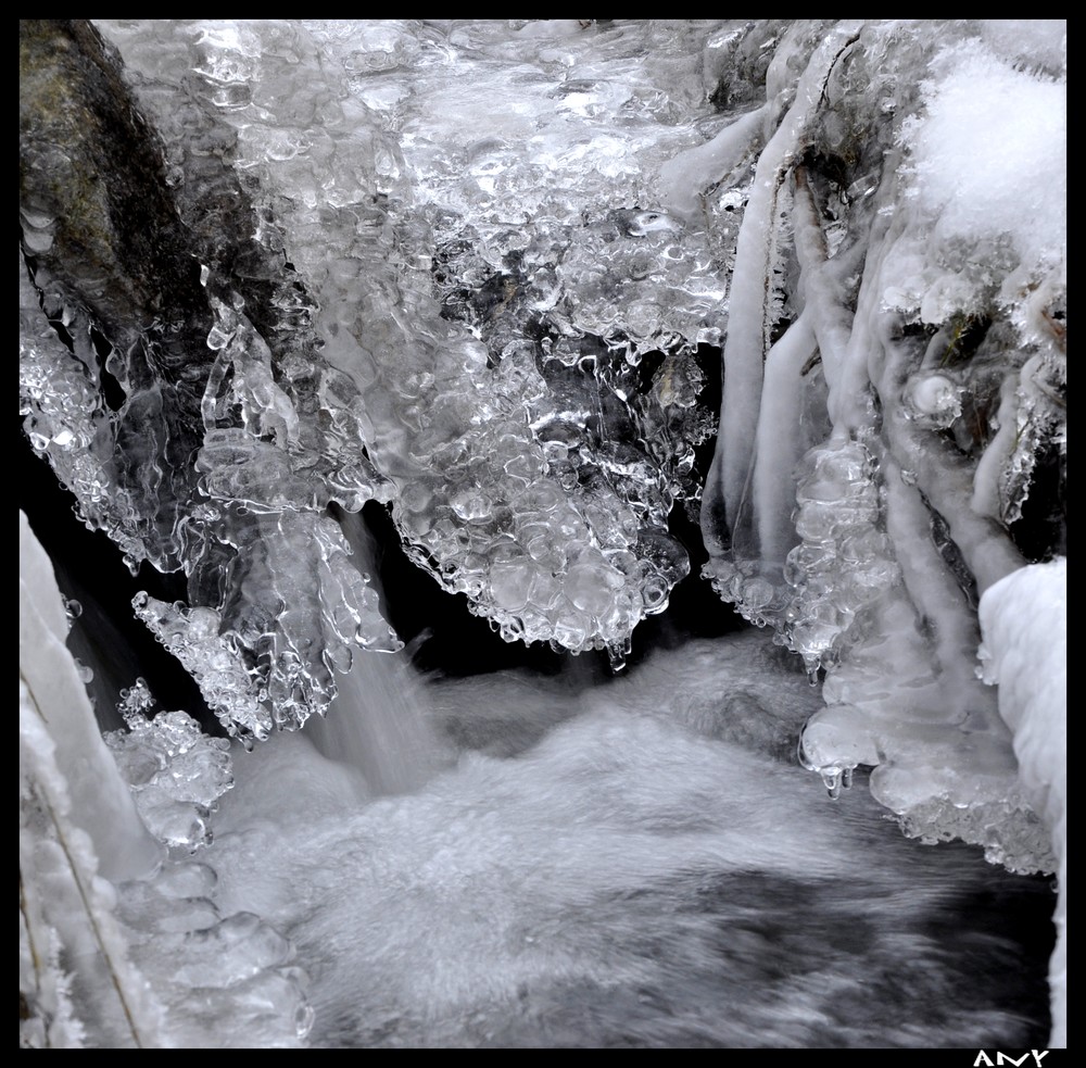 Eric, pour moi je vois 2 points forts, mais ils se sont perdus peut-être dans mon recadrage ! ce sont les 2 opposés : le mouvement de la chute d'eau et l'immobilité de la glace, les 2 se juxtaposent.