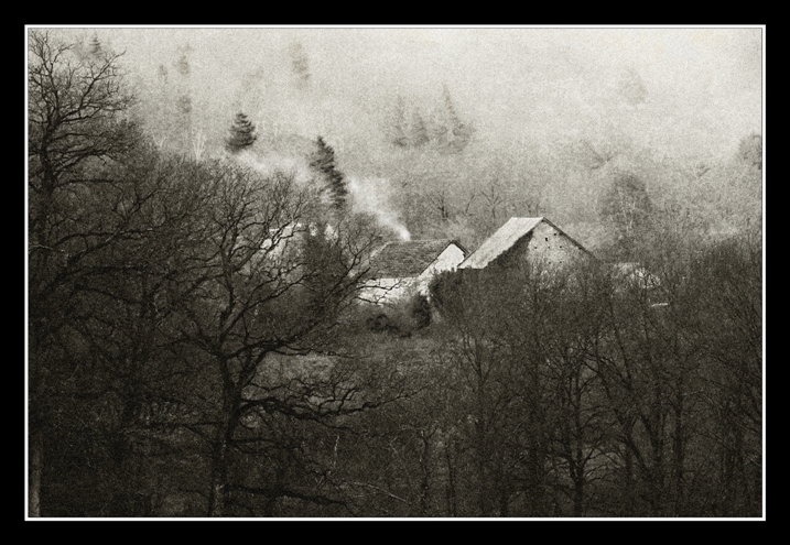 Bon voilà l'essai de recadrage ; pour moi, il enlève une bonne part de mystère car la " maison blanche qui fume " est moins isolée au milieu des bois, la perspective donnée à la prise de vue, accrue par le téléobjectif qui écrase pas mal les plans avait fait "disparaitre" le finage agricole de ce petit village et je trouve que le recadrage plus serré laisse la porte ouverte vers quelque chose de plus habituel, de plus large, de plus ouvert; m'enfin, après, c'est une simple question d'interprétation.