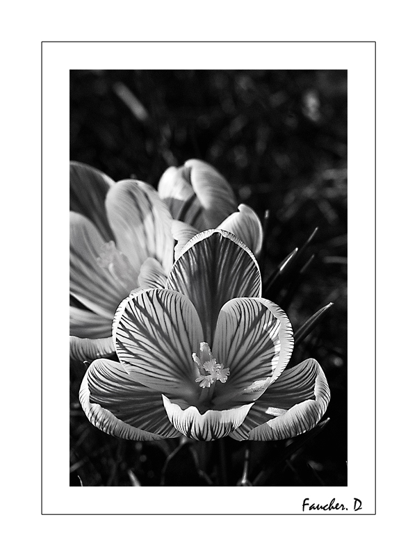 Joli, les détails des nervures ressortent très bien et ta compo triangulaire est agréable ; c'est un peu dommage d'avoir enlevé la couleur d'une fleur mais bon, c'est ton choix ; tu n'as pas essayé une désat partielle pour garder la couleur et noyer l'herbe , enfin, juste pour voir.