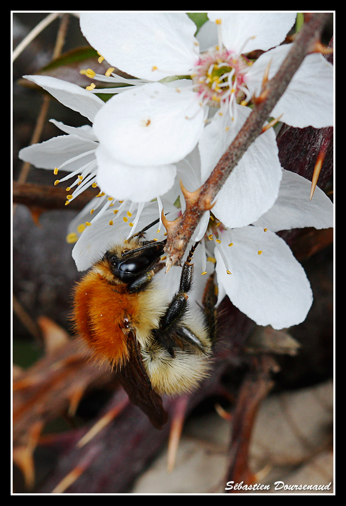 Hier à Panazol, juste avant les pluies torrentielles, un Bourdon des champs (Bombus pascuorum) butinait tranquillement les fleurs immaculées d'un magnifique cerisier tout de blanc vêtu...
