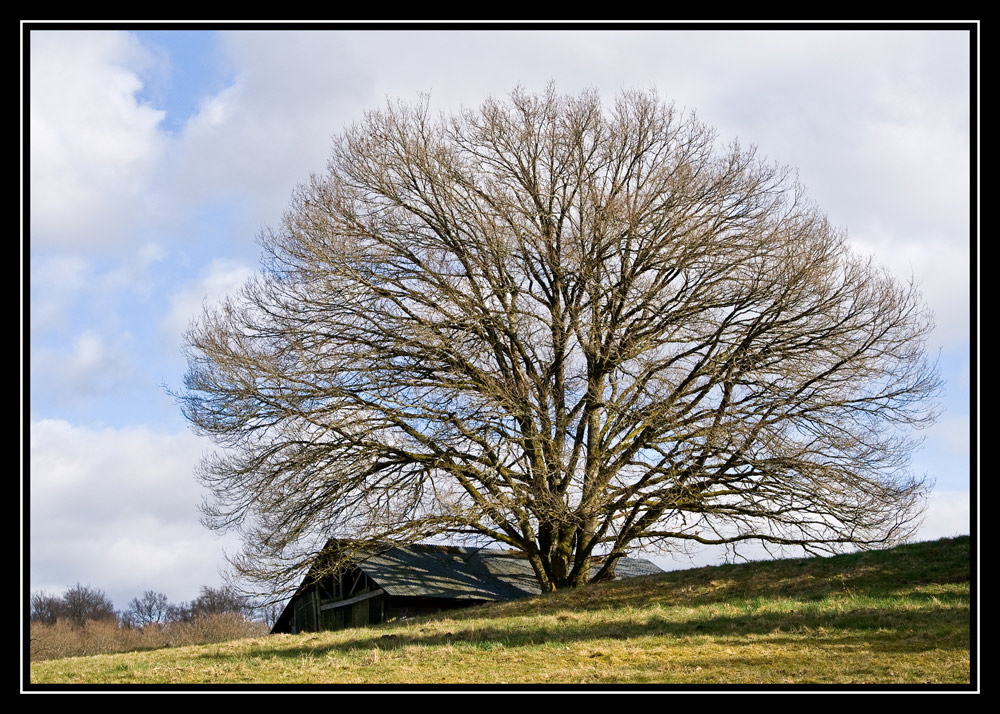 Avec le beau temps, ballade dans mon pays bessinaud autour de l'étang de Sagnat. Je trouve un coté protecteur a cet arbre vu son envergure. J'ai fait differents essais, celui-ci me parait le mieux meme si j'ai legerement recadré sur la droite, ça me parassait un brin centré.