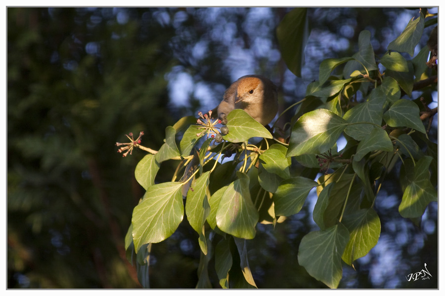 Dans le même esprit que le pinson, cette femelle fauvette au coucher du soleil... dans son garde manger temporaire