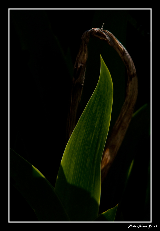 Ma démarche ici a été de constater qu'en pleine lumière les contrastes étaient intéressants (déjà faut regarder tranquilleement) sur les iris et de me dire qu'en sous exposant (de combien?) j'allais mettre les lignes des feuilles en évidence. Au cadrage j'ai vu comment composer tout ça au mieux, j'ai aussi eu la surprise de la tige en arrière plan sur la 2 (à l'oeil ça ne se voyait pas, c'est l'effet doubleur sur longue focale) et j'ai essayé de l'utiliser au mieux pour ajouter une autre courbe.