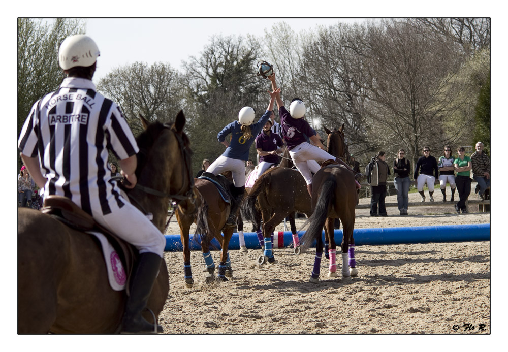 Je suis allée voir du Horse ball féminin. Deux equipes à cheval, s'affrontent, doivent réaliser un enchainement de 3 passes et marquer un panier, sans faire tomber la balle et sans se la faire piquer par l'autre équipe bien sûre.