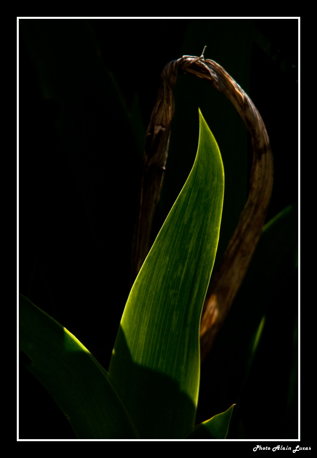Ma démarche ici a été de constater qu'en pleine lumière les contrastes étaient intéressants (déjà faut regarder tranquilleement) sur les iris et de me dire qu'en sous exposant (de combien?) j'allais mettre les lignes des feuilles en évidence. Au cadrage j'ai vu comment composer tout ça au mieux, j'ai aussi eu la surprise de la tige en arrière plan sur la 2 (à l'oeil ça ne se voyait pas, c'est l'effet doubleur sur longue focale) et j'ai essayé de l'utiliser au mieux pour ajouter une autre courbe.