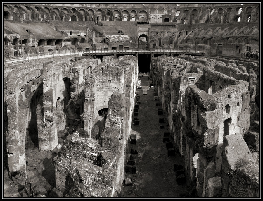 La deuxième série, celle dont font partie ces deux photos, c'est la Rome antique, celle des monuments anciens, de l'histoire, de la rudesse des mœurs, de la violence omniprésente (même si c'est là que se trouvent les fondements de notre société), et pour faire ressentir çà, le noir et blanc et les forts contrastes me paraissent mieux adaptés.