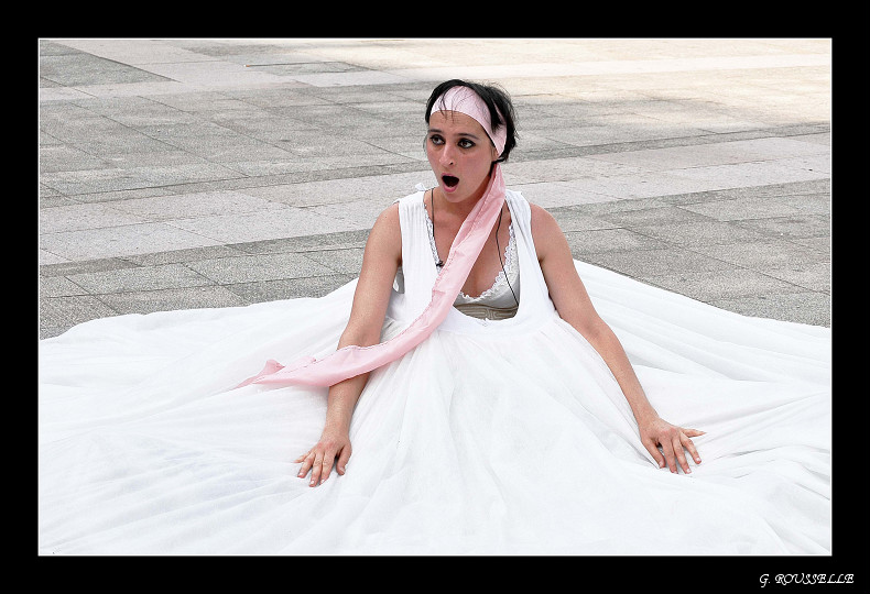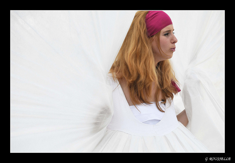 J'aime bien l'idée : le personnage sur le fond blanc de sa propre robe (et puisqu'elle est blanche : sur le fond de sa robe propre