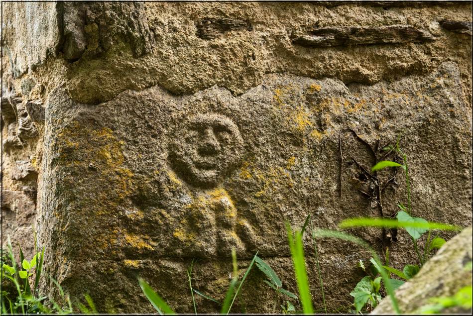 Une ( très ) vieille pierre , réutilisée dans la construction d'une ( vieille ) maison.