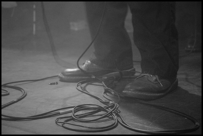 Ouais bonne idée, mais surveille le "décor", sur un sujet comme ça ça devient super important et il faut bien l'intégrer dans le cadrage: c'est assez réussi sur la 2, on sait tout de suite où on est simplement avec les câbles au sol et l'atmosphère machine à fumée (trop grisouille c'est vrai) mais sur la 1 toute la moitié droite en diagonale ne sert à rien, j'aurais mis en premier plan le sujet principal et les chaussures en écho au second plan sans perdre tout cet espace. Un cadrafe au télé rapproche les plans st renforce cet aspect statique/symétrique que tu veux faire ressortir