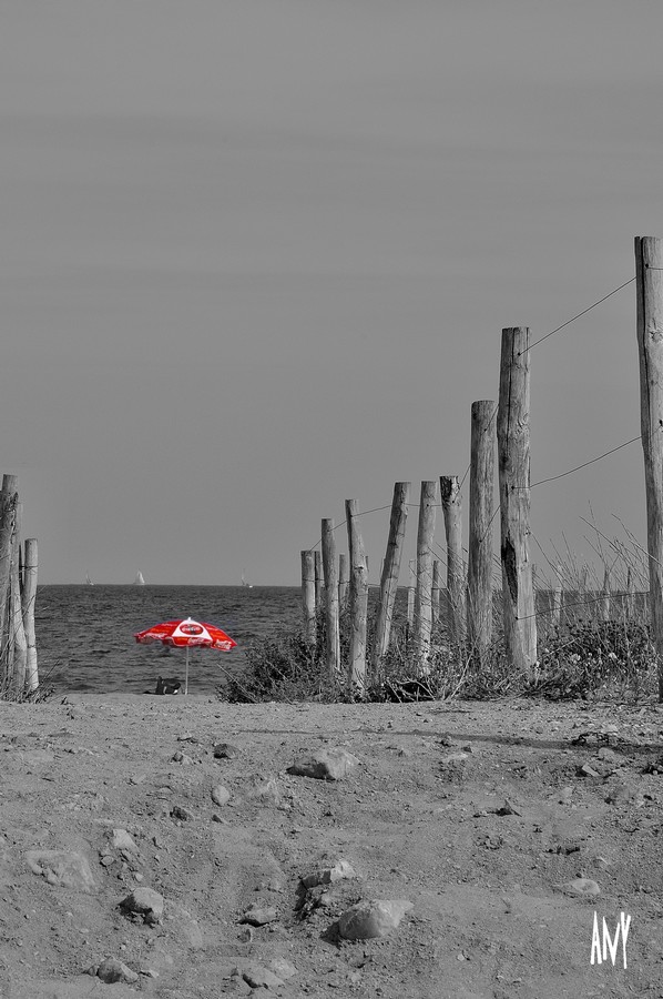 Bonne idée ; mais ton N&B manque un peu de caractère, il est un peu raplapla ; d'autre part, comme Philippe, je trouve que le ciel prends trop de place ; je pense qu'un cadrage paysage aurait accentué l'effet de perspective des piquets vers ton parassol et renforcé l'impact de ton image.