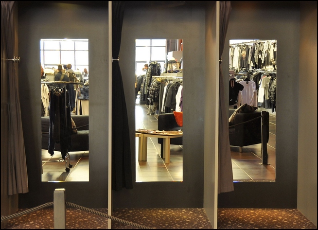 et pour fignoler si tu as moyen : un cadrage plus serré qui vire le rideau de gauche pour laisser 3 cases de cabine d'essayage parfaitement identique au cadrage, sans élément pour les différencier les unes de autres. La seule différence serait dans les miroirs et ce qu'on y voit... et justement, là il peut y avoir de l'humain...
