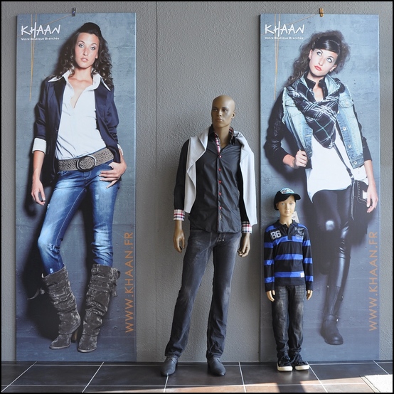 Après, si t'es bien pote avec la direction du magasin et qu'ils acceptent que tu y mettes un peu le "souk" (je t'avoue que perso j'oserai pas... mais bon, je te donne l'idée et après tu en fais ce que tu veux), pourquoi ne pas refaire la même photo en cadrage serré, mais avec un mannequin dans une des cabines, et des humains dans les autres... Ou un mannequin dans une cabine, un humain dans une deuxième et une vide dans une troisième (ou inversement pour faire une progression du vide vers l'humain, puis vers le mannequin qui remplace l'homme au final).