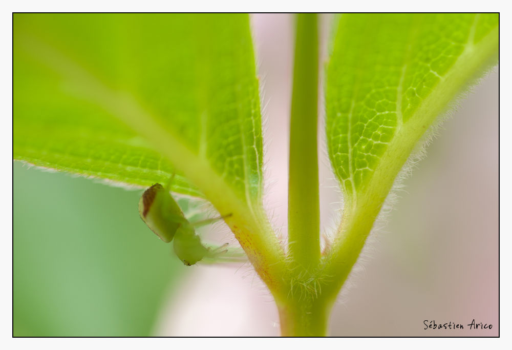 Pour les 2 dernières préférence pour la 1, plus lisible( eh oui, ce foutu problème!), très jolie, là encore toute douce, vert sur vert, monochrome, j'aime ça! et si je ne me trompe pas tu as Misumenia mâle qui bien sûr est beaucoup plus petit que Madame!