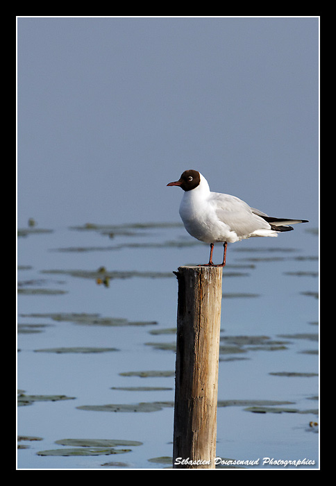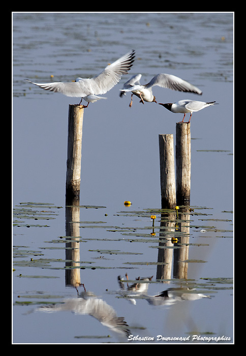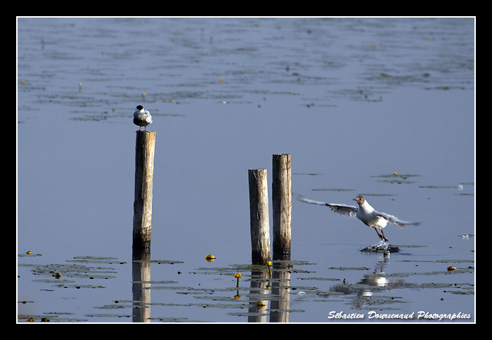 Arrivé à l'affût, je fais le tour des lieux et me poste à une ouverture qui m'a l'air intéressante. Devant moi, une troupe de Mouettes rieuses s'affaire à leur toilette matinale et "joue" à leur jeu favori qui est le "pousse toi de là que je m'y mette" sur les piqués en bois disposés dans l'eau devant l'affût.