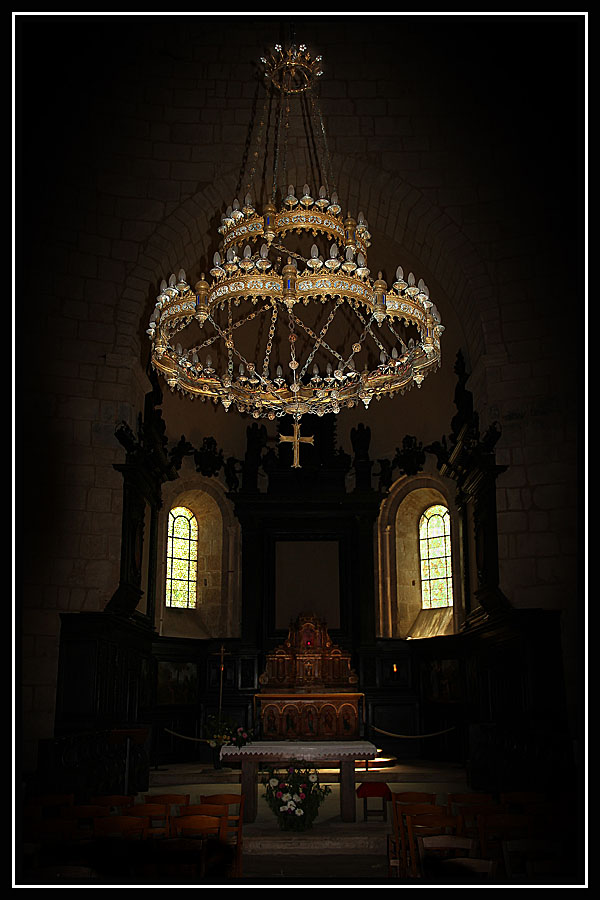 Mon contrat : prendre en photo ce lustre éteint dans la petite église romane de St Jean de Cole (24) non éclairée.
