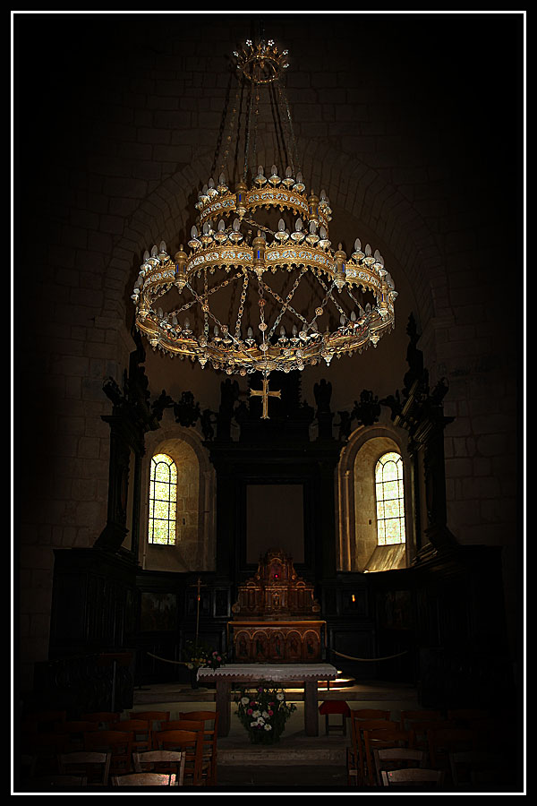 Mon contrat : prendre en photo ce lustre éteint dans la petite église romane de St Jean de Cole (24) non éclairée.
