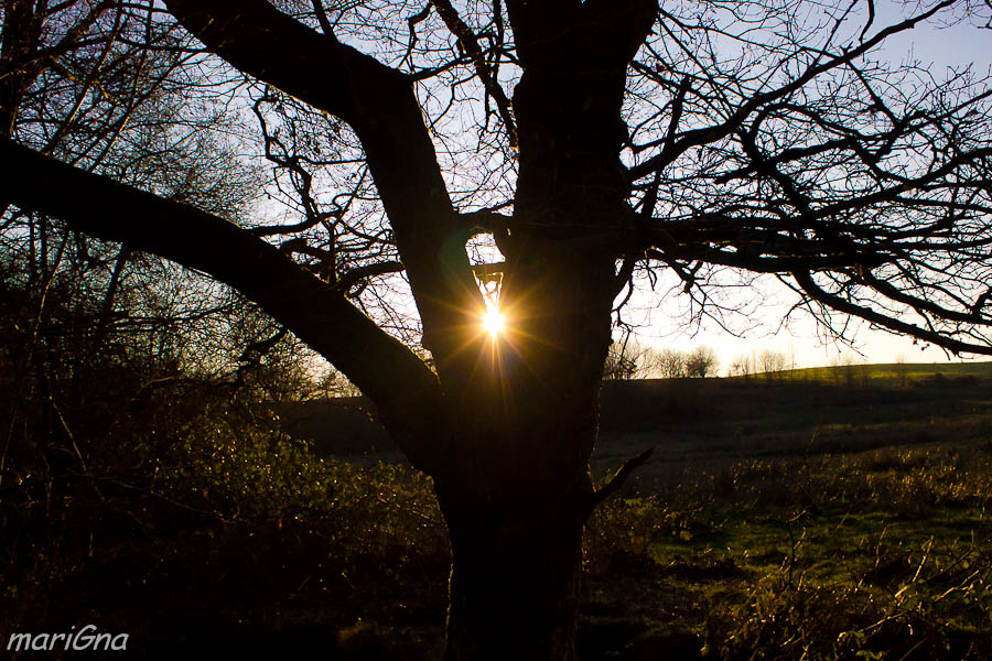 Le soleil au centre ne me gène pas vraiment (si tu l'avais décalé, je pense que tu te serais retrouvé avec de l'espace vide qui sert à rien) mais, quitte à tailler les branches de l'arbre, j'aurais carrément vu un cadrage vertical pour accentuer la verticalité du tronc