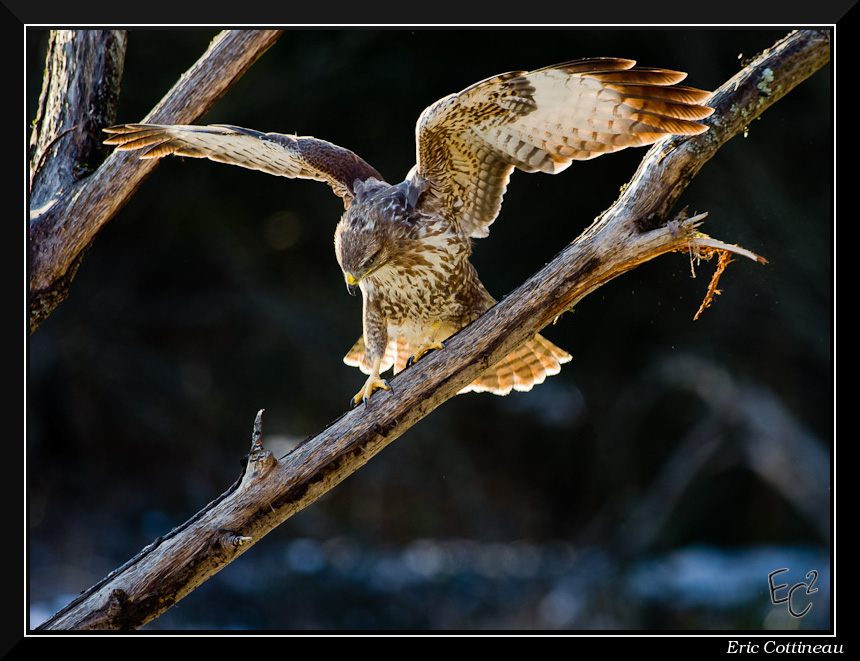 Ce n'est pas encore parfait, y a des branches parasites, la lumière n'était pas top mais j'ai passé 1h30 magique avec une buse à 15 mètres de moi.