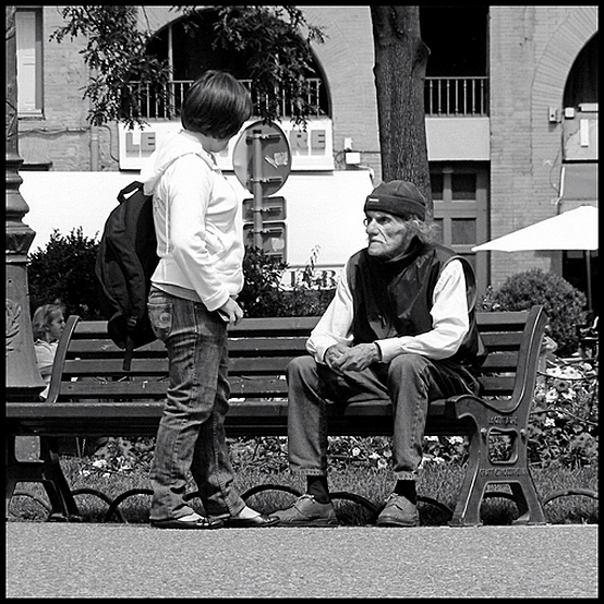 Tu aurais pu aussi essayer de centrer encore plus l'attention sur ce type du banc en utilisant une ouverture proche de f/2 pour l'isoler davantage (tu étais avec un télé non ?).