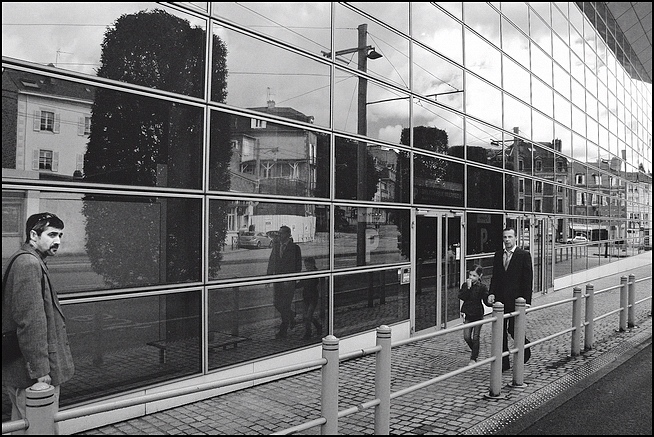 Pour répondre à Nanie: Ce qui m'a tout d'abord intéressé, c'est le reflet de la rue dans les baies vitrées puis, quand j'ai vu que j'étais repéré par l'homme de droite, son regard à la fois méfiant et intrigué a fait que je me suis dit, pourquoi pas?