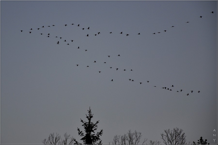 Belle série de Grues au couchant. J'adore ces conditions de prise de vue, ça fait plusieurs jours que je vais à leur rencontre en anticipant leur trajectoire grâce aux radars météo où elles sont "visibles" quand elles sont en grand nombre (dimanche soir dans le sud du département, on a vu les mêmes à 20 min d'intervalle, et hier soir dans le nord du département). Cela fait beaucoup de km mais quel spectacle de voir tous ces vols successifs qui passent pendant parfois des heures sur la même trajectoire. Partager ce spectacle avec mes enfants, ça n'a pas de prix