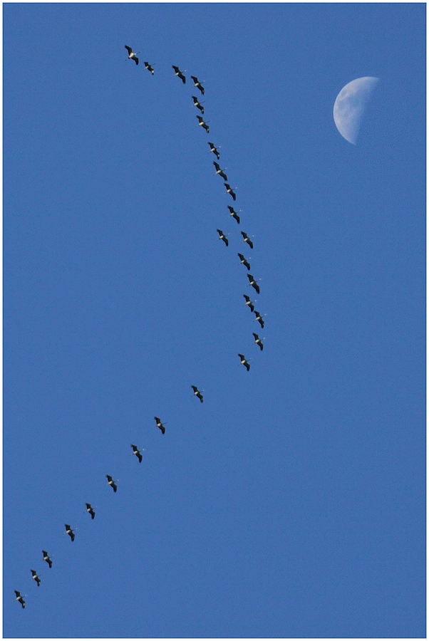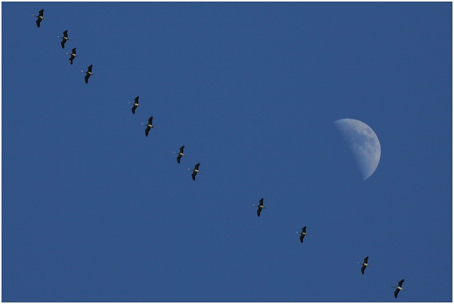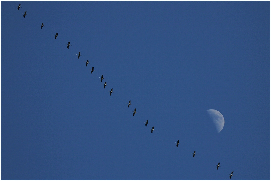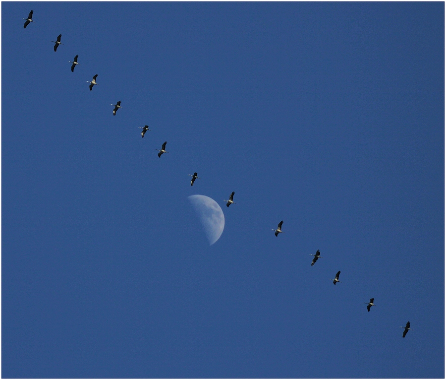 La face éclairée de la lune indique que le soleil se trouve vers la gauche et donc que les Grues vont vers le soleil, ce qui serait le cas au mois de novembre mais pas un 29 février. A cette époque, les Grues remontent dos au soleil, il faudrait donc que tu "retournes" ta lune dans le bon sens pour que ton montage soit cohérent avec tes exifs (je sais, je suis ch....)