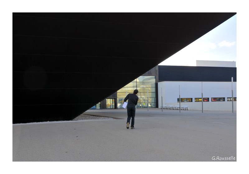 GG, je reste bouche bée devant cette dernière photo! Quelle composition! Déjà au niveau du décor, tous ces triangles qui s emboîtent parfaitement, ces rectangles, ces lignes et ces couleurs, ca mérite déjà un 5 étoiles. Et cerise sur le gâteau, le personnage vient parfaitement s'implanter au milieu de tout çà, avec sa démarche et tête penchée parallèlement au haut... Je suis en admiration, bravo.