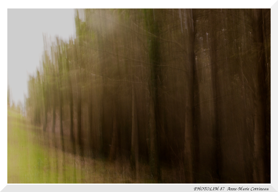 bon ceci dit, techniquement le filé consiste à suivre le déplacement d'un sujet à la même vitesse pour que le sujet soit net et le fond flou... là, sauf surprise, c'est pas vraiment les arbres qui bougent...