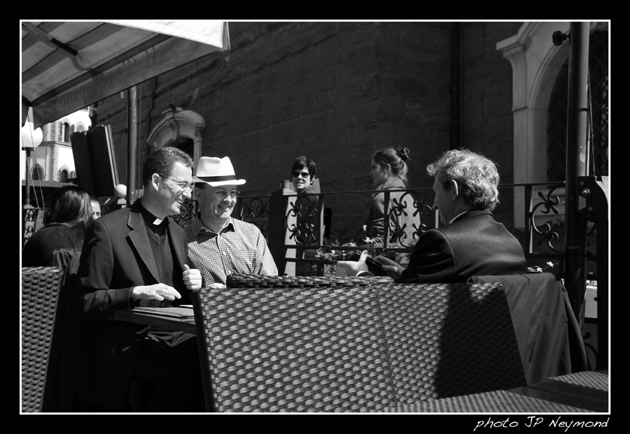 J'aime bien ce noir et blanc les gars sont vraiment natures... c est super avec le pere qui les accompagnent tout naturellement a cette terrasse de cafe.