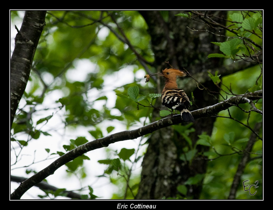 Après une courte attente, une première huppe ( le mâle ?) arrive avec une larve au nid... Aussitôt la seconde passe la tête par le trou pour ensuite sortir par un autre trou.