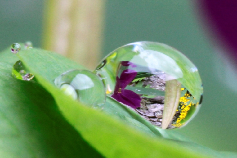 1/ dommage pour la masse sombre de la fleur en haut à droite, et globalement j'aurais préféré que tu décales un peu la goutte vers la droite (et donc ainsi peut-être éviter de couper la feuille sur la gauche?)