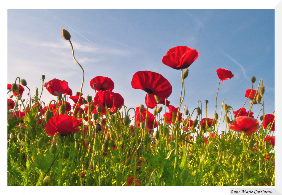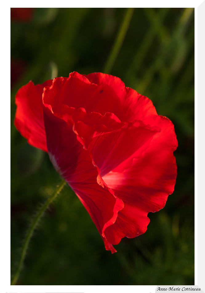 je l'aime bien celui ci : le coquelicot remplit bien la photo et j'aime la lumière rasante qui met en avant les "poils" sur la tige