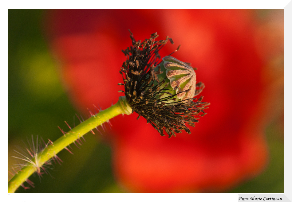 je l'aime bien celui ci : le coquelicot remplit bien la photo et j'aime la lumière rasante qui met en avant les "poils" sur la tige