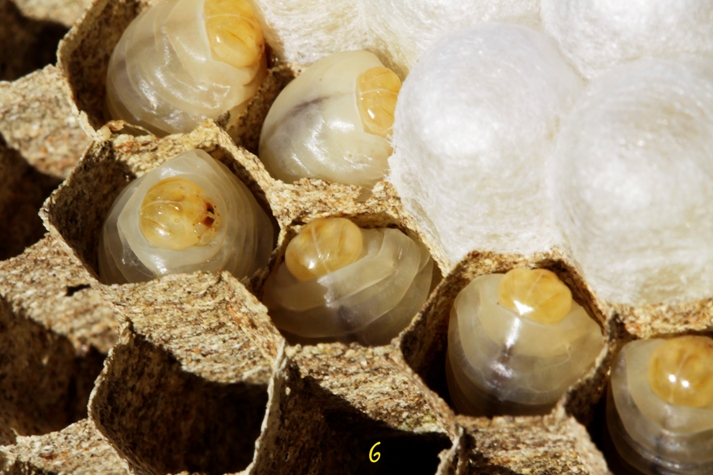 ) curieux d'en voir plus, j'ouvre délicatement l'enveloppe extérieure aux ciseaux et découvre la merveille d'architecture : deux plateaux d'alvéoles de taille différente sur un axe central unique, le tout parfaitement protégé par un feuilletage de cellulose aggolomérée, isolant du froid et de l'eau (3) ; le plateau supérieur laisse apparaître des alvéoles ouvertes où des mouvements apparaissent et des alvéoles "operculées" par une sorte de capuchon de parchemenin (4) ; je continue ma dissection : le plateau inférieur comporte quelques larves mortes mais surtout des oeufs qui semblent intacts (5) ; je sépare les deux plateaux en coupant le pédoncule central et je découvre des larves qui s'agitent au soleil dans leurs alvéoles ouvertes (6) puis je découpe des opercules pour trouver des chrysalides également bien vivantes, malgré le traitement chimique infligé (7).