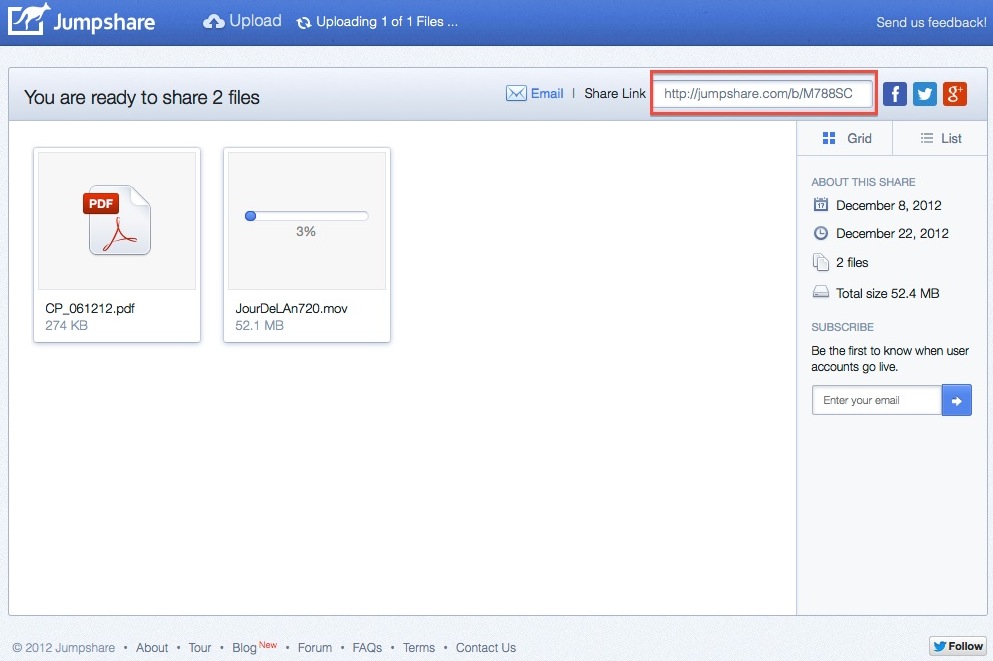 Le lien est valide même avant la fin de l'upload des fichiers. Par contre laissez votre navigateur internet ouvert sur la page jumpshare jusqu'à la fin de l'upload bien sûr.