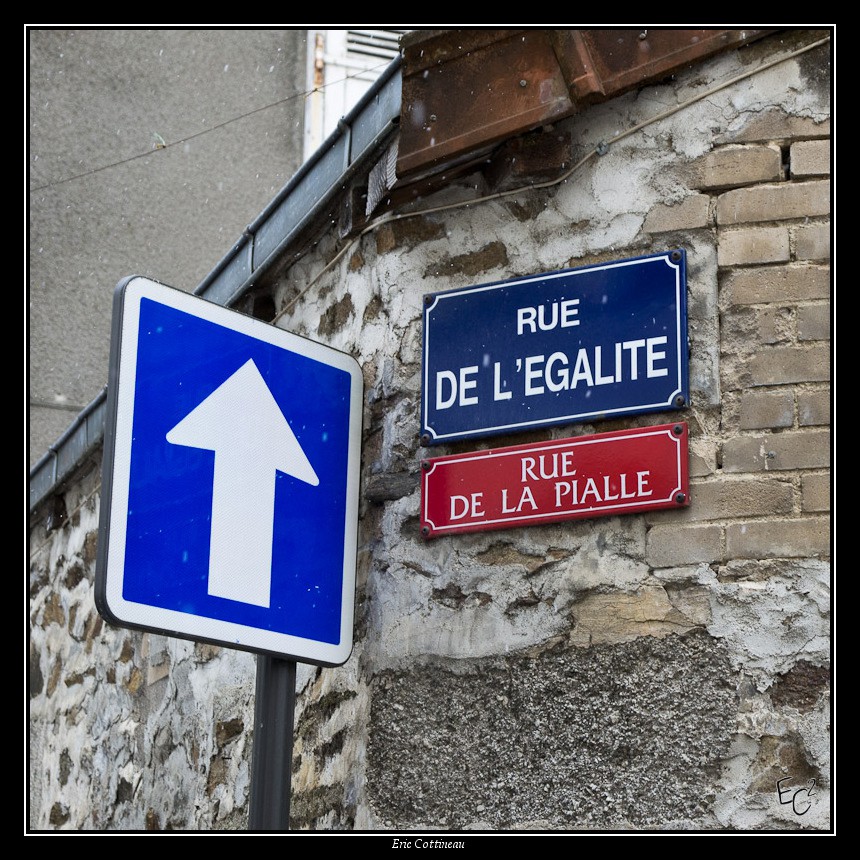 Tiens, en parlant d'égalité, regardons-la par en dessous, histoire de relever la tête ... "valeur" suprème de la République, nous tire-t-elle vraiment vers le haut ? Comment expliquer qu'elle soit démentie, voire bafouée, au moins par la pensée, à chaque instant, par 99,9 % de la population mondiale ? Comment la concilier avec l'individualisme institutionnalisé du marché et de la culture sociale d'aujourd'hui ? Heui ... temps mort ...