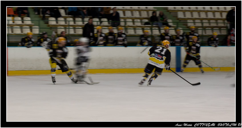 Bon, c'est un exercice intéressant mais compliqué. Ca va vite, ils partent dans tous les sens, le palet est petit. Pas facile de sortir des photos correctes. En fin de match, je commençais un peu à comprendre la stratégie globale, enfin je pense