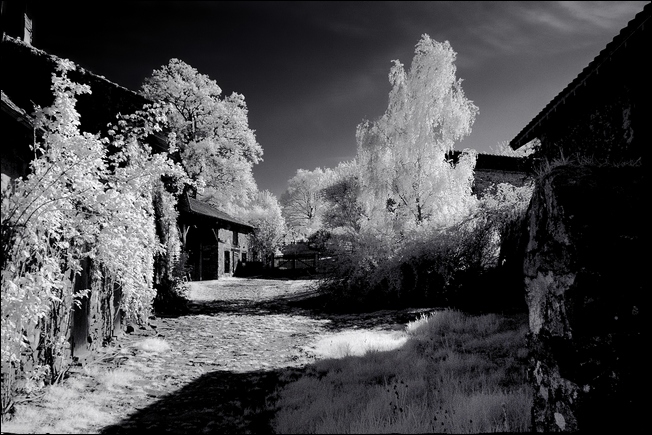 Le domaine de l'IR, que j'effleure, est vraiment passionnant; on est obligé de "penser IR" en reconvertissant les couleurs perçues en rendu infrarouge; par exemple, les feuillus aux feuilles bien vertes auront un rendu blanc alors que les résineux resteront dans les tons de noirs de même, celui qui veut photographier des moutons bien blancs dans un champ bien vert aura peut être une grosse surprise.