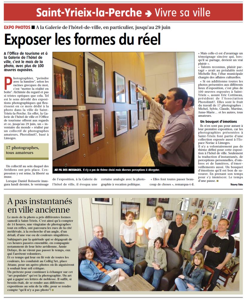 - une exposition collective à la galerie de l’hôtel de ville de St-Yrieix : du 15 au 29 juin 2013, vous pourrez y retrouver près de 60 photos exposées par 15 photographes différents.