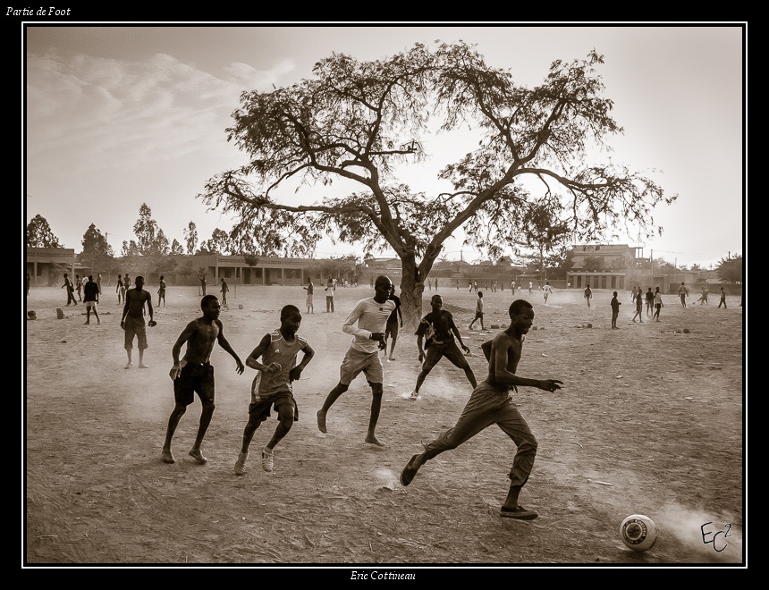 Les gamins, après quoi courent-ils ? Le ballon ? on le découvre à la droite de l'image, donc il s'agit bien d'un jeu de foot ! Alors revenons sur la gauche de l'image : les buts sont bien là, à la mode africaine et ça n'enlève rien à l’énergie de ce match de foot. Comme l'arbre au milieu du terrain ou les pieds nus, rien n'altère l'engagement des joueurs. C'est là que l'image me séduit.