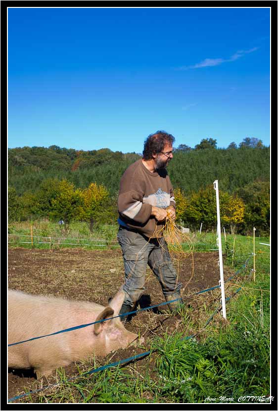 Travail à la ferme: Eric et Pierre ont changé les cochons de parc. En arrière plan quelques feuillages d'automne.