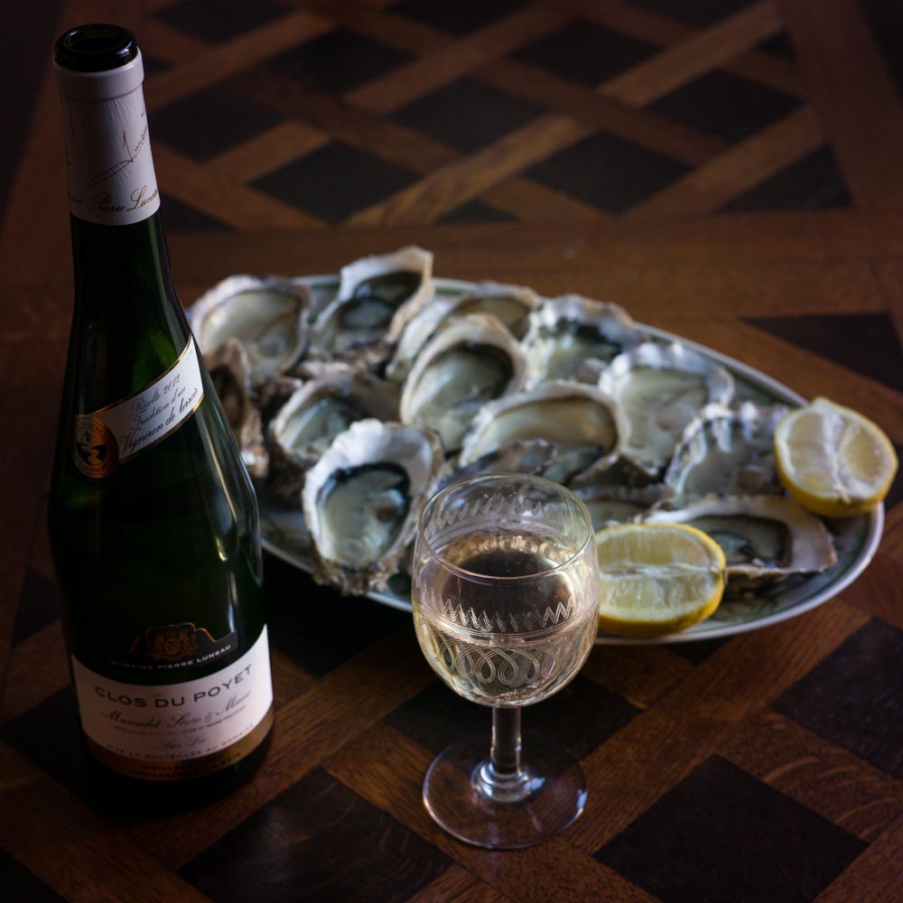 As tu essayé de baisser l'appareil de manière à avoir le vin parfaitement net dans son verre, la bouteille légèrement floue et les huitres un peu plus (floues)... avec une lumière plus dure comme tu sais les faire.?
