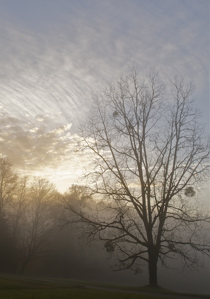 J'aime bien ta toute première image. La brume est présente. Je trouve la composition équilibrée, avec l'arbre à droite qui "répond" au ciel à gauche. Ciel intéressant car il semble entourer l'arbre. Le soleil qui apparait derrière les arbres apporte une teinte chaude qui s'oppose à l’impression de froid donnée par la brume.