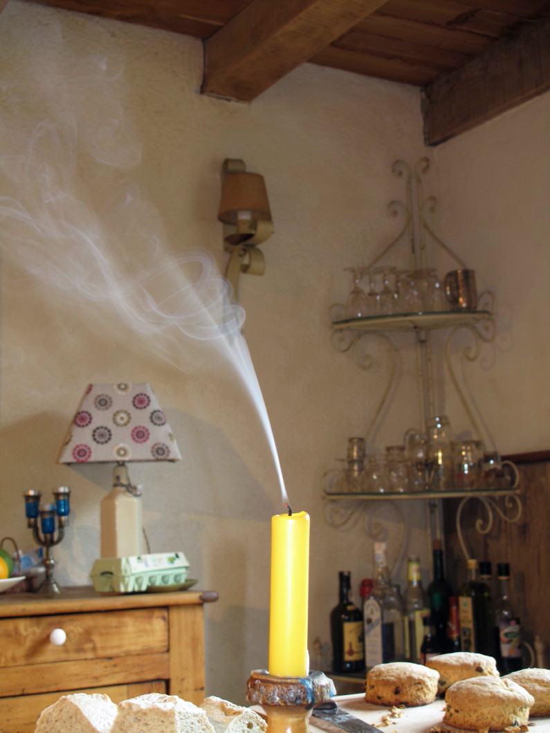 1- trouver un fond noir ou très sombre avec un éclairage latéral (fenêtre) qui fasse ressortir la fumée de la bougie.