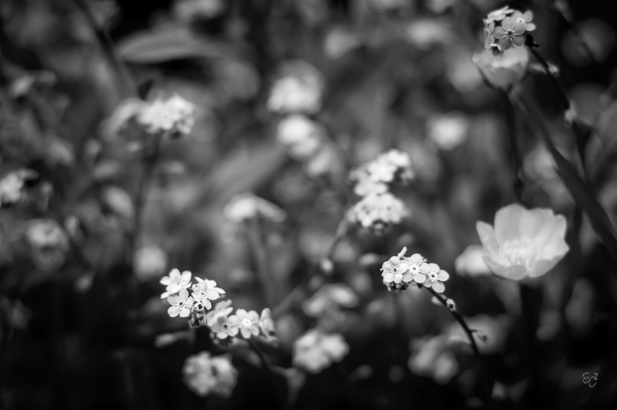 Il en va de même pour l'espèce de renoncule à droite qui est plus grosse que les autres fleurs mais dans le flou. Elle attire l’œil plus que les Myosotis.