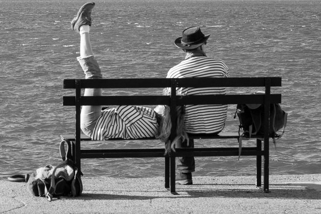 J'aime les couleurs mais je ne sais pas ou donner des yeux, le monsieur au chapeau regarde à droite et il y'a la jambe de madame qui attire l'attention du coup j'accroche pas. En n/b recadré je trouve que ça claque mieux, excuses moi pour la vulgarité de ma manip