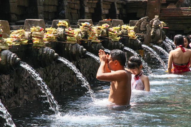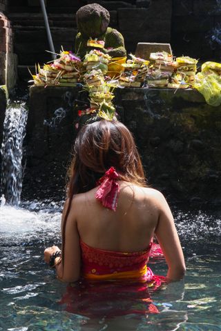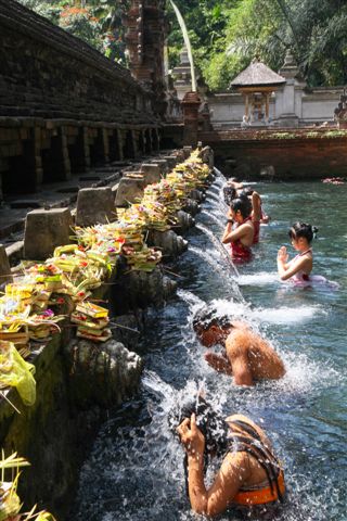 Tirtah Empul la source bénie des dieux.Après avoir déposé leurs offrandes au dessus du jet de la source, les pélerins prennent leur bain sous l'eau aux vertus bienfaisantes......
